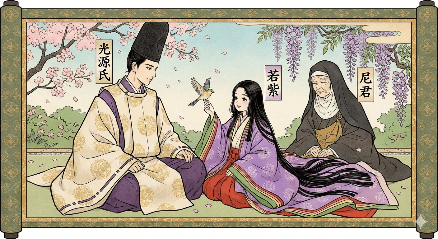 尼君、「いで、あな幼や。いふかひなう ものし給ふかな。おのが かく今日明日におぼゆる命をば、何とも思したらで、雀慕ひ給ふほどよ。罪得ることぞと常に聞こゆるを、心憂く。」とて、「こちや。」と言へば、つい ゐたり。つらつきいとらうたげにて、眉のわたりうちけぶり、いはけなく かいやりたる額つき、髪ざし、いみじううつくし。ねびゆかむさまゆかしき人かな、と目とまり給ふ。さるは、限りなう心を尽くし聞こゆる人に、いとよう似奉れるが、まもらるる なり けりと思ふにも涙ぞ落つる。