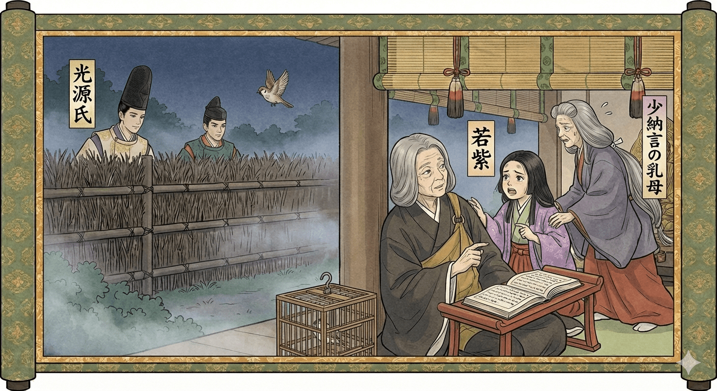 「何ごとぞや。童べと腹立ち給へるか。」とて、尼君の見上げたるに、少しおぼえたるところあれば、子な めりと見給ふ。「雀の子を犬君が逃がしつる、伏籠のうちに籠めたり つるものを。」とて、いと口惜しと思へり。このゐたる大人、「例の、心なしの、かかる わざをしてさいなまるるこそ、いと心づきなけれ。いづ方へかまかりぬる、いとをかしう やうやうなりつる ものを。烏などもこそ 見つくれ。」とて立ちて行く。髪ゆるるかにいと長く、めやすき人な めり。少納言の乳母とぞ人言ふめるは、この子の後見なる べし。