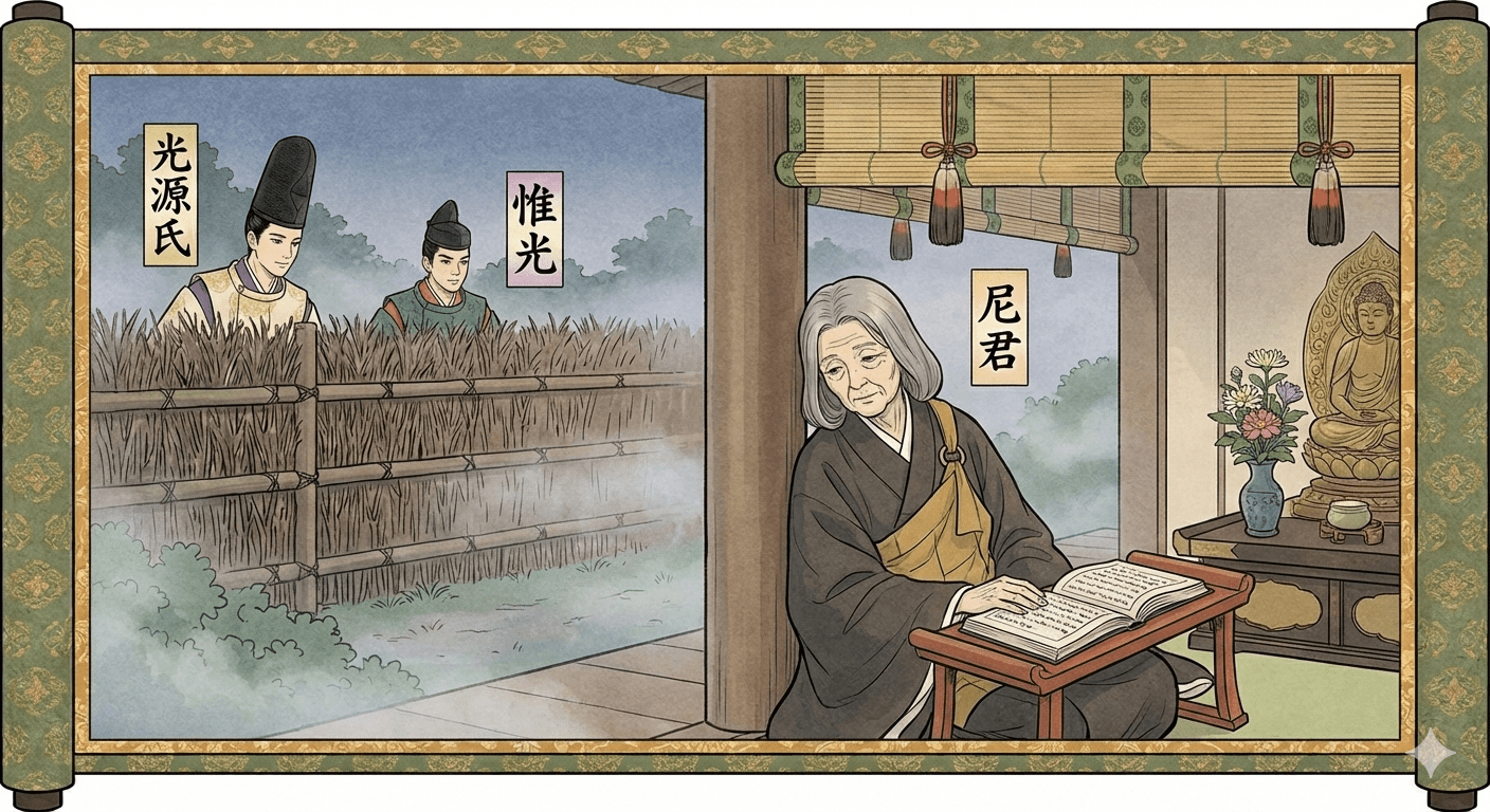 日もいと長きに、つれづれなれば、夕暮れのいたう霞みたるに紛れて、かの小柴垣のもとに立ち出で給ふ。人々は帰し給ひて、惟光朝臣とのぞき給へば、ただこの西面にしも、持仏据ゑ奉りて行ふ尼なり けり。簾少し上げて、花奉るめり。中の柱に寄りゐて、脇息の上に経を置きて、いと悩ましげに読みゐたる尼君、ただ人と見えず。四十余ばかりにて、いと白うあてに痩せたれど、つらつきふくらかに、まみのほど、髪のうつくしげにそがれ たる末も、なかなか長きよりもこよなう 今めかしきものかな、とあはれに見給ふ。